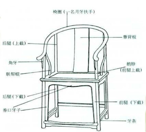 關于圈椅的結構構造,我們就用最經典也是最原始的明式圈椅作為描述對象,它的每個結構構造以及命名術語包括: