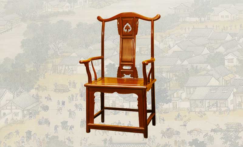 再則是官帽椅,官帽椅可分為南官帽椅和四出頭式官帽椅兩種。所謂四出頭,實質就是靠背椅子的搭腦兩端、左右扶手的前端出頭,背板多為“S”型,而且多用一塊整版制成。南官帽椅的特點是在椅背立柱和搭腦相接處作出軟圓角,由立柱作榫頭,橫梁作榫窩的煙袋鍋式做法。椅背有使用一整版做成”S”形,也有采用邊框鑲板做法,雕有圖案,美觀大方。