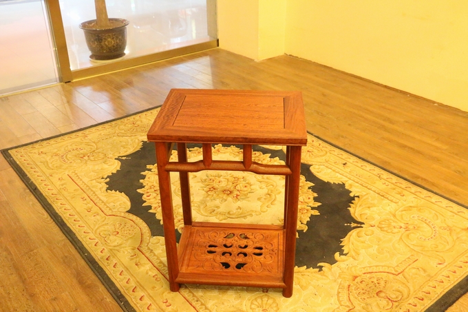 另外該套沙發同樣是為了滿足其人們實用性的需求,在大平幾的上方特別精心設計了左右兩格抽屜,方便了人們平時使用時用來存放物品。素面淡雅的桌面,光整圓潤,簡約筆直的座腳設計,暗合了整套沙發圈椅中注重線條感之特點,另外平幾下方的踏板之上還設有一繪有四格的“四蝠朝古錢”的紋飾圖案,象征著滾滾財源以及美好與幸福的祝福寓意。而高幾處之設計風格同樣與沙發大平幾保持了一致,使之搭配更為一體,而唯一一處雕飾同樣是位于高幾的下方板面處,那形似蔓草(亦稱唐草,隋唐時期特別流行)的紋飾,加之些許鏤空雕刻作為處理,在更顯古典古風之余還寄寓了人們、長久的吉祥寓意,莊華而浮美。