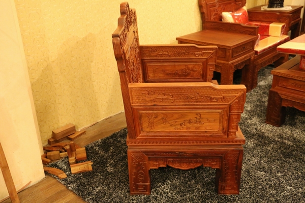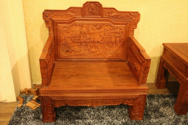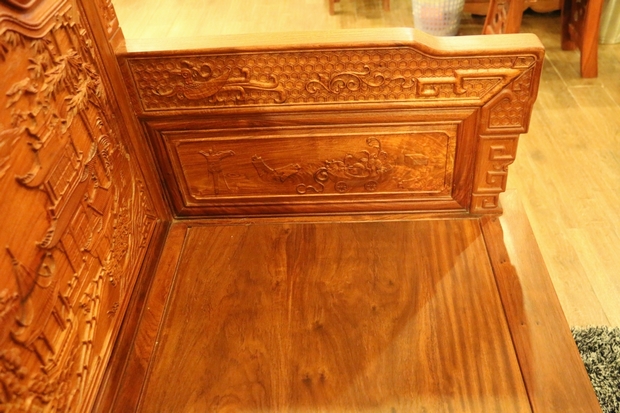 沙發的座椅面平整光滑,極盡原木材質紋理之視覺感受;側面扶手處無任何鏤空面積之留飾,嚴實而框整,整體框架為矩形外觀設計。扶手上端正反兩面位置處,同樣雕繪有上處靠背板處鳳凰圖案形狀之紋飾,扶手底部正反兩面位置則雕繪有一些商周時期使用的器具,如斟酒器、編鐘等。